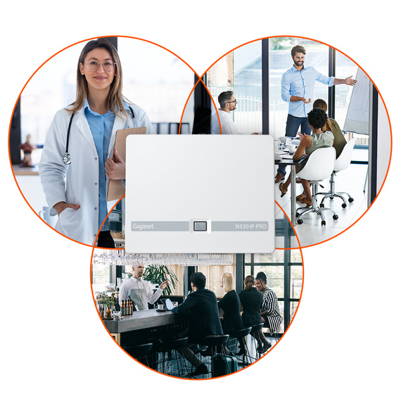 Gigaset N530 IP PRO, kompakt tasarımıyla dikkat çeker ve ajans, muayenehane, restoran veya kuaför salonu gibi her türlü küçük işletmede esnek bir şekilde kullanılabilir.